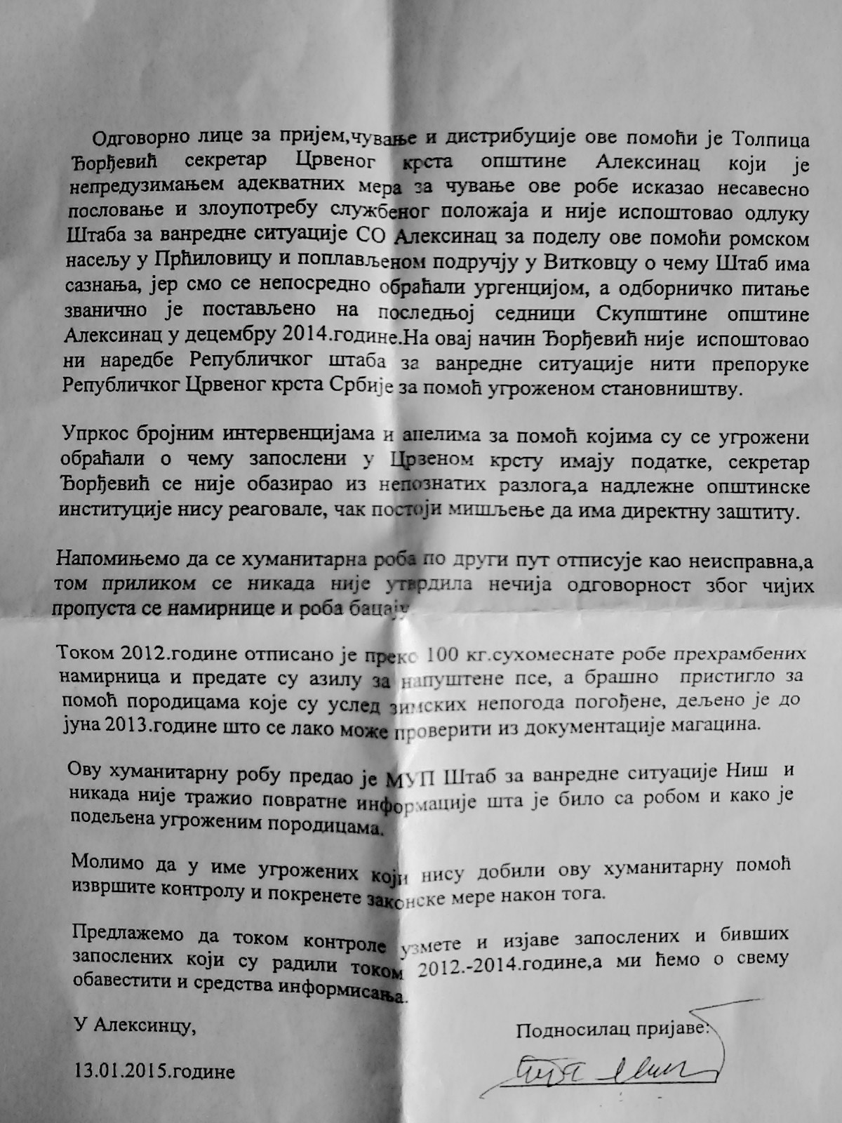 Алексинац.Нет је дошао у посед писма у коме подносиоци пријаве наводе да је било озбиљних пропуста у подели намирница намењених поплављеним подручјима.